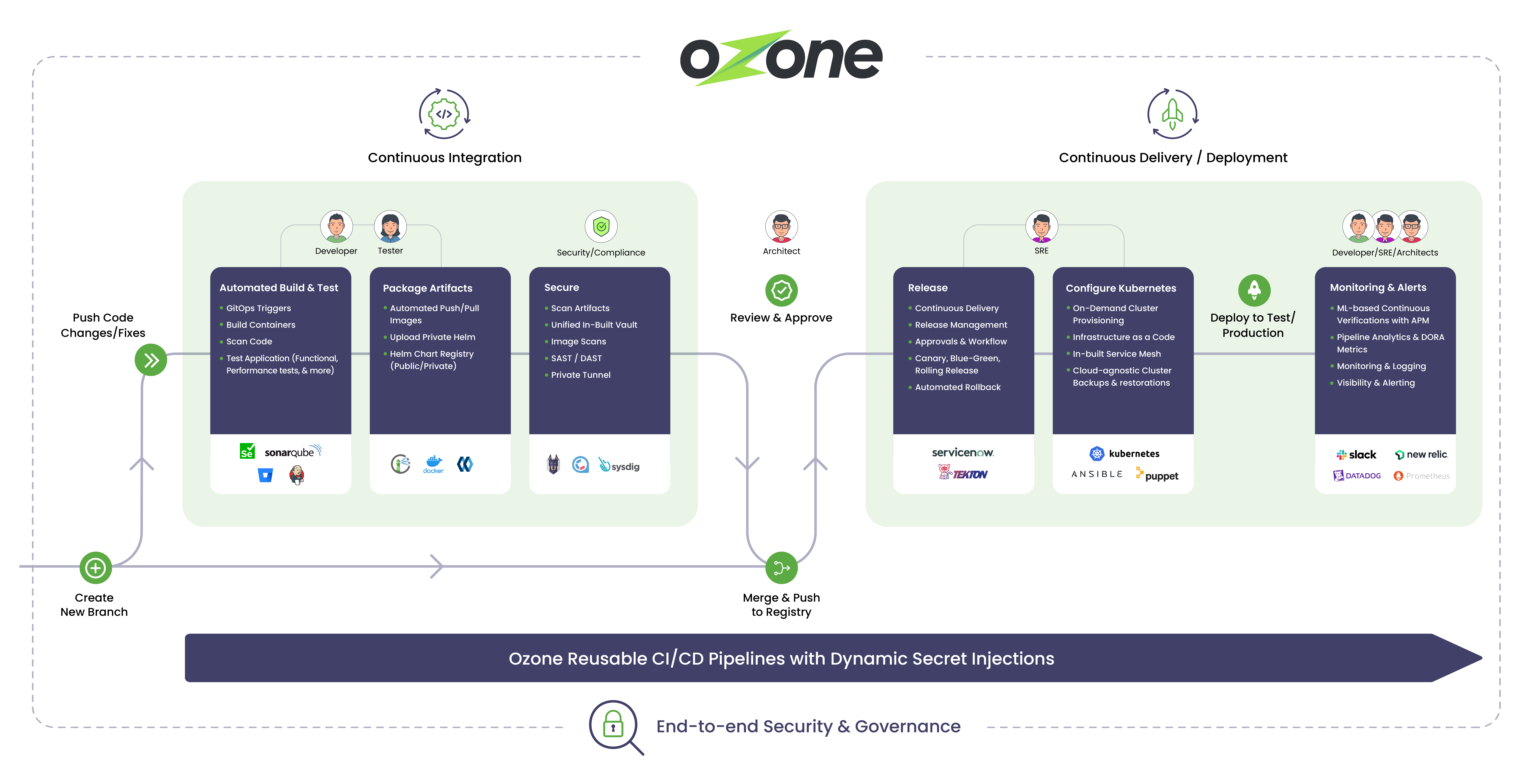 Secure, Comply and Govern: Ozone offers an in-built vault (powered by Hashicorp) with dynamic secret injections into the pipelines for secure and automated secrets management across every stage of CI/CD. Security and compliance is provided via pipeline integration to third-party application security testing (AST) tools. To prevent promoting noncompliant changes to production environments, Ozone enables creating compliance rules and enforcing scans for configuration changes. For static analysis of vulnerabilities, Ozone integrates with CodeScan, SonarApex, Trivy, Claire, Prisma, Snyk, and SonarQube. To promote transparency and compliance, Ozone leverages granular RBAC and SSO.